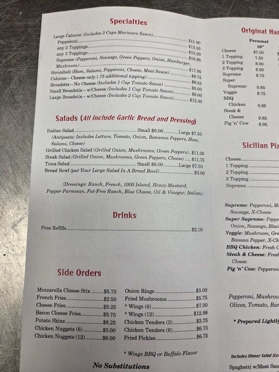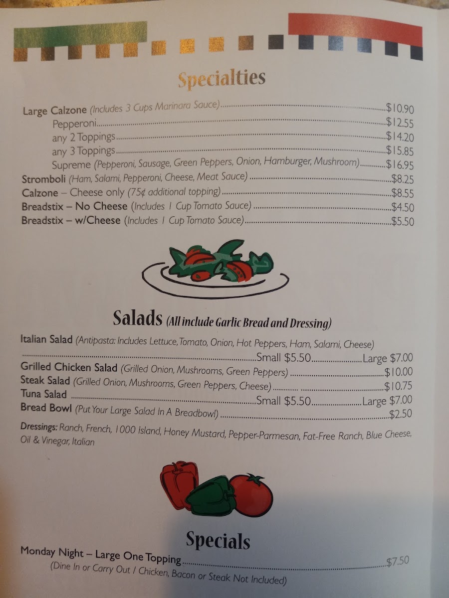 Guests often find themselves enjoying a large calzone or a steak and cheese sub during relaxed lunches or cozy family dinners. The simple classics like cheese pizza and manicotti fit perfectly with the welcoming, homey atmosphere where good food feels familiar and straightforward. Fresh salads with breadsticks or a side of crispy onion rings round out the meal, ideal for those looking to balance lighter options alongside indulgent bites.